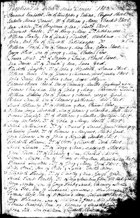Our William Wakeling was baptized 9 October 1803 in St Mary Parish, Whitechapel, Stepney, London, England. William’s parents were James Wakeling and Eleanor of George Yard.
