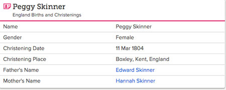 Margaret “Peggy” Skinner was baptized 11 March 1804 in Boxley, Kent, England by parents Edward and Hannah Skinner.