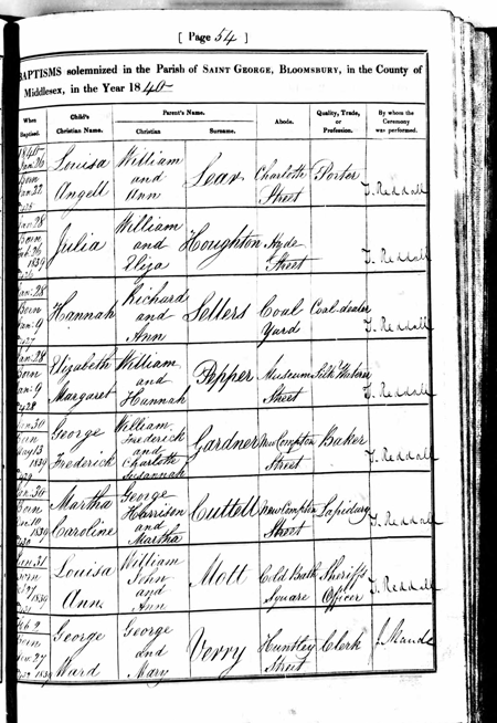 Baptism: England, County of Middlesex, Bloomsbury, Parish of Saint George: 1840, bottom of page 54;