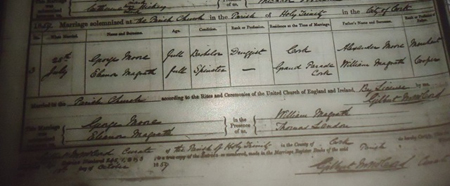 George Moore married Eleanor Magrath 28 July 1859 in Holy Trinity (Christ Church) in Cork, Ireland by license.