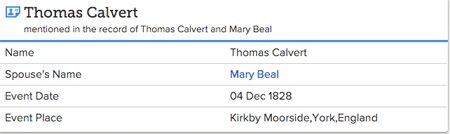 Born 1800 in Yorkshire, England. 1830 to USA. Dairy farm for Detroit. Died 1848 in Detroit, Michigan. BIRTH According to his tombstone, Thomas Calvert was born 1 July 1800 in Old Malton, Yorkshire, England. Parents of Thomas Calvert are not known, but appears that father may be John Calvert. There are