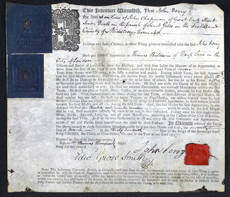 Born about 1783 in London, England. Apprentice 1797 for 7 years as barber/wigmaker.  Died est. 1825. BIRTH At this time we do not have documentation for a birth date for John Verry. There are two clues: A Freemason Membership Registration in 1814 listed John Verry (Hair Dresser) birth year of 1788. A death record lists birth year as 1783. BAPTISM APPRENTICE John Verry son in law of John Chapman of Great East Street Seven Deals in the parish of Saint Giles in the Fields and County of Middlesex shoemaker apprenticed to Thomas Baldwin of Harp Lane in